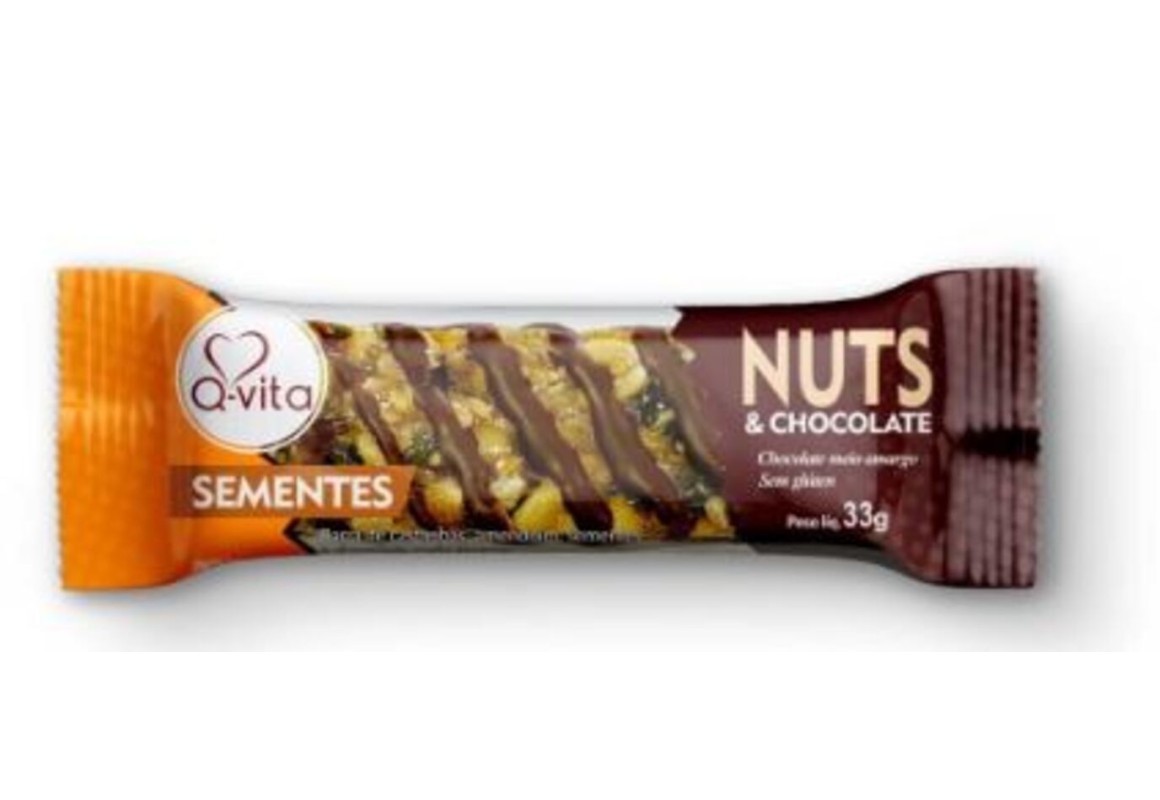 Nuts Barra proteica sabor Sementes com Chocolate Q-Vita é uma barrinha, que além de saborosa é muito nutritiva, as barras de cereais são uma ótima opção para quem enfrenta a correria do dia a dia e quer aproveitar os vários benefícios das fibras, como a redução do colesterol, a melhora do trânsito intestinal, etc. Até mesmo pessoas que estão em dieta para redução de peso as consomem, a fim de terem à saciedade aumentada, já que as barras podem satisfazer a vontade de comer doce, sem colocar a dieta em risco por serem bem menos calóricas.